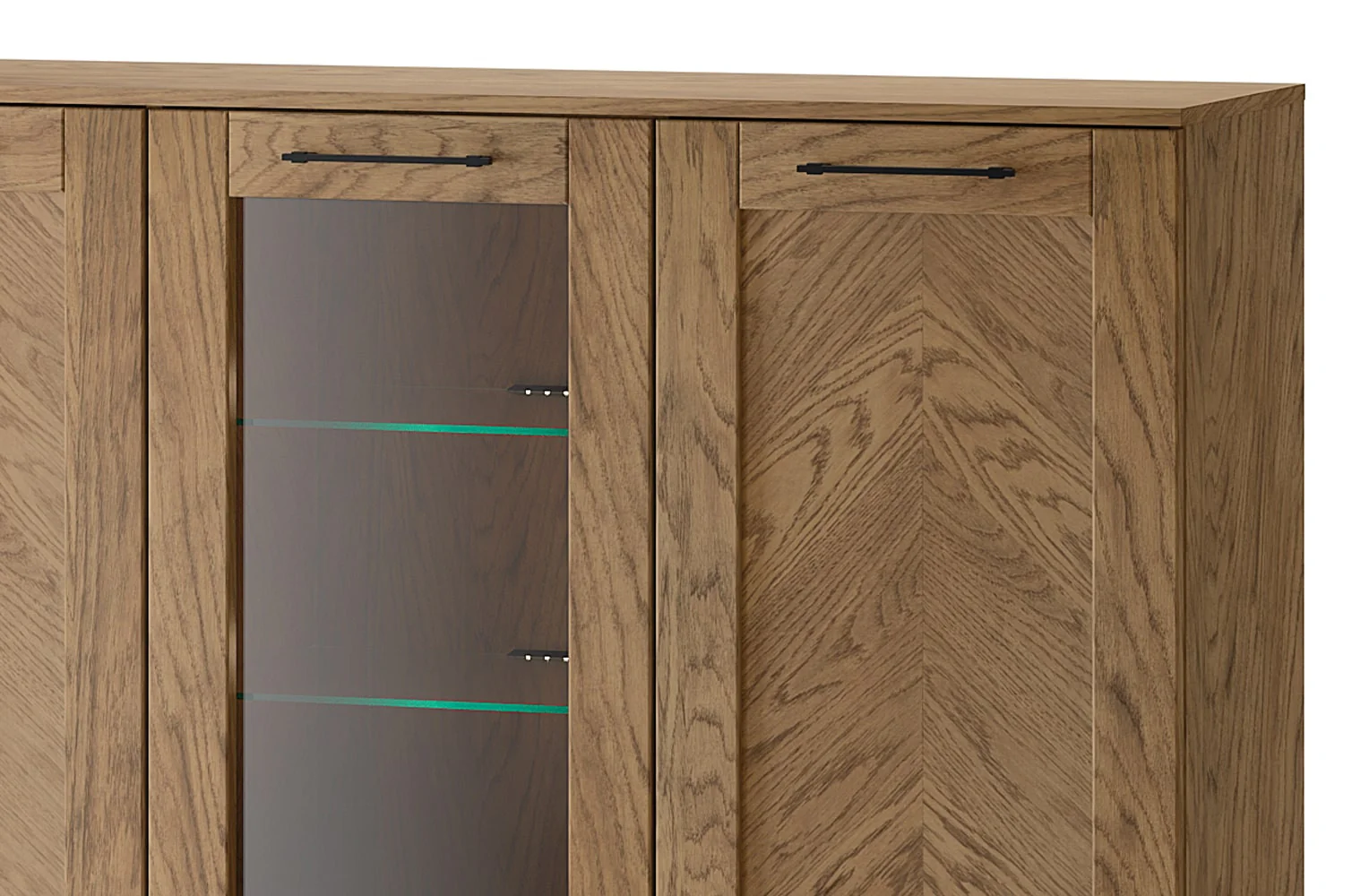 La cómoda COZY 45 combina funcionalidad, diseño y elegancia natural. Fabricada en roble rústico aceitado, destaca por su frente en patrón de espiga y el contraste sutil del vidrio ahumado en la puerta central, que añade un toque decorativo sin perder armonía.