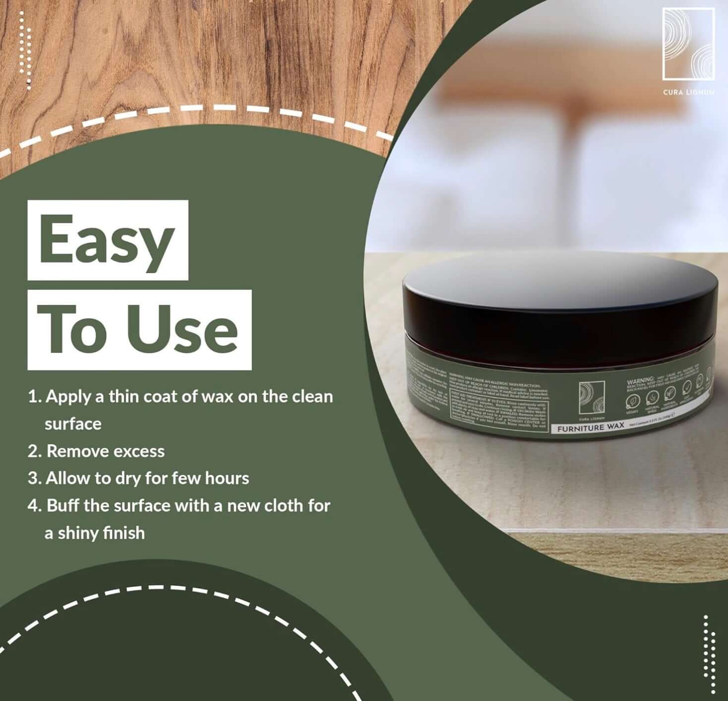 FÁCIL DE USAR: Aplica una capa fina de nuestra cera de abeja natural para madera Cura Lignum sobre la superficie limpia del mueble, luego remueve los excesos y deja reposar durante varias horas hasta que esté seco. Finalmente, debes pulir la superficie con un paño nuevo para lograr un acabado brillante.