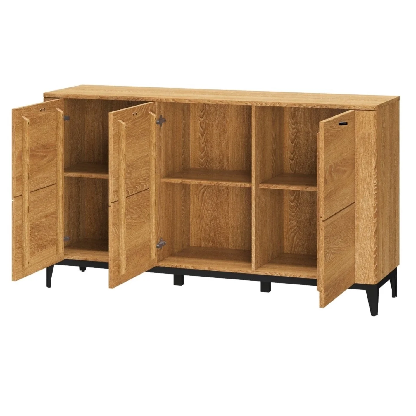 El Aparador Oporto 46 realizado en madera maciza de roble cepillada está acabada con elementos de metal en negro mate, aportando la ligereza visual de las patas en los muebles modernos. Consta de tres puertas y seis baldas que dan gran capacidad de almacenaje para tu salón, comedor o dormitorio. Puedes combinarla con nuestros muebles de la misma colección para crear una casa de ensueño.