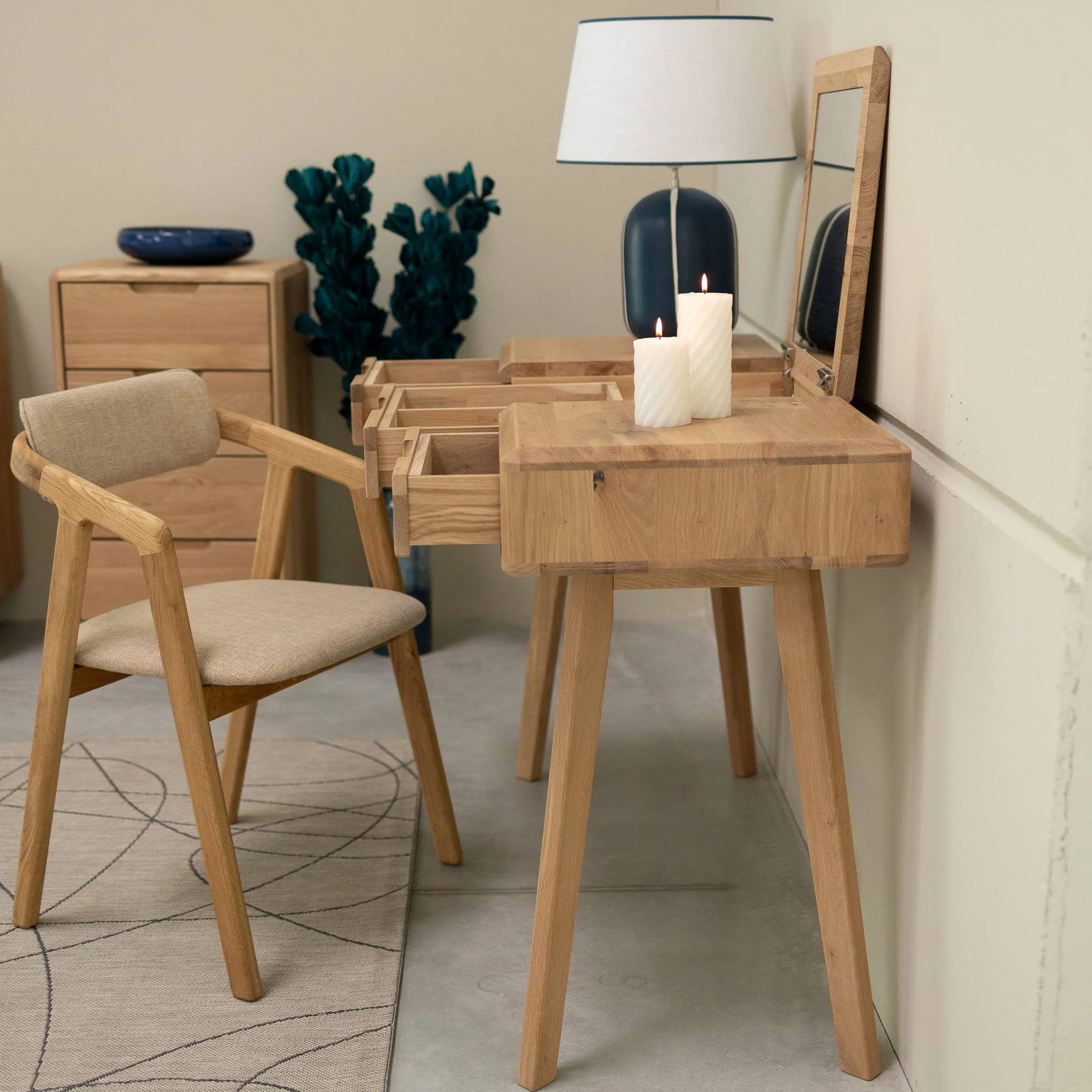 El tocador Sweden 1 en madera maciza de roble o nogal fusiona la practicidad con la elegancia en un diseño que combina funcionalidad y estilo.
