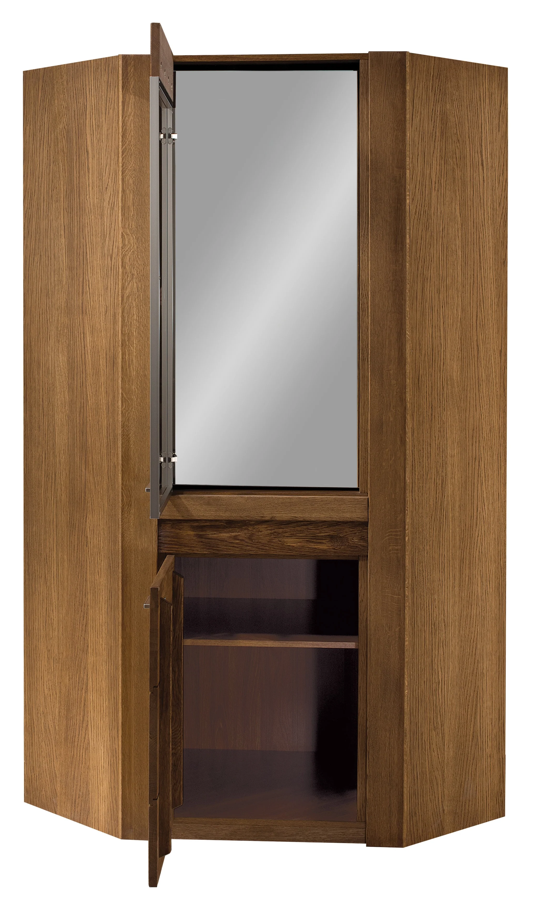 La vitrina Velvet 16 con un estilo único, aporta a tu comedor o salón un toque moderno y elegante al combinar la calidez de la madera de roble rústico aceitado con vidrio templado y acero cepillado. La pieza es una vitrina de rincón con dos puertas, la superior de vidrio templado y la inferior de madera maciza, con estantes de gran capacidad en su interior.